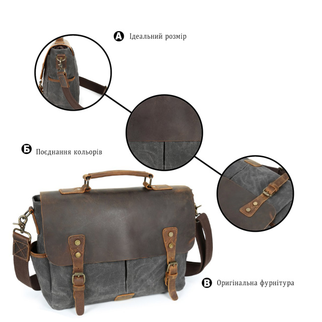 Вместительный винтажный мужской портфель в классическом стиле. С таким порфтелем вы будете выглядеть солидно. Модель изготовлена из вощеной парусины в сочетании с натуральной винтажной кожей. В изделие легко поместится ноутбук. Ткань очень крепкая. В дизайн сумка дополнена ремешками на клапане. Модель имеет множество удобных карманов и прекрасно подойдет для повседневной жизни. Портфель сочетается с любым вашим стилем. Такой портфель станет хорошим и доступным подарком для любого мужчины. Изделие станет находкой для деловых мужчин.