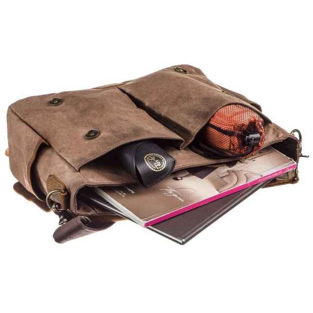 Качественный портфель в комбинации канвас и натуральной кожи. Изделие очень плотное и прослужит вам очень долго. Модель дополнена фурнитурой цвета латуни. Портфель идеально подойдет для людей, которые связаны с бизнесом и поклонников делового стиля. Аксессуар вы можете носить в руках или через плечо. Изделие будет находкой для любого мужчины. Если вы ищете подарок для делового мужчины – рекомендуем вам этот портфель.