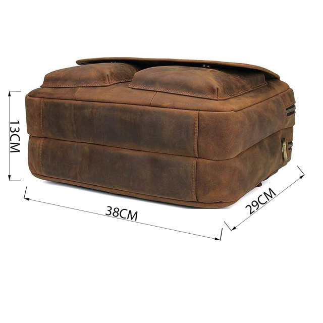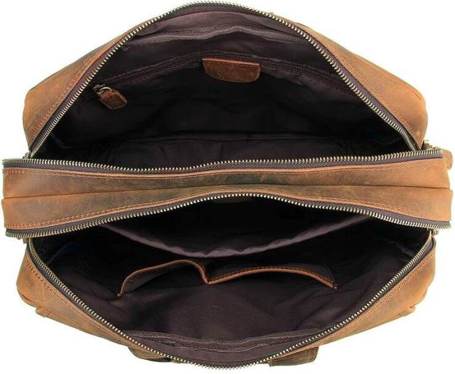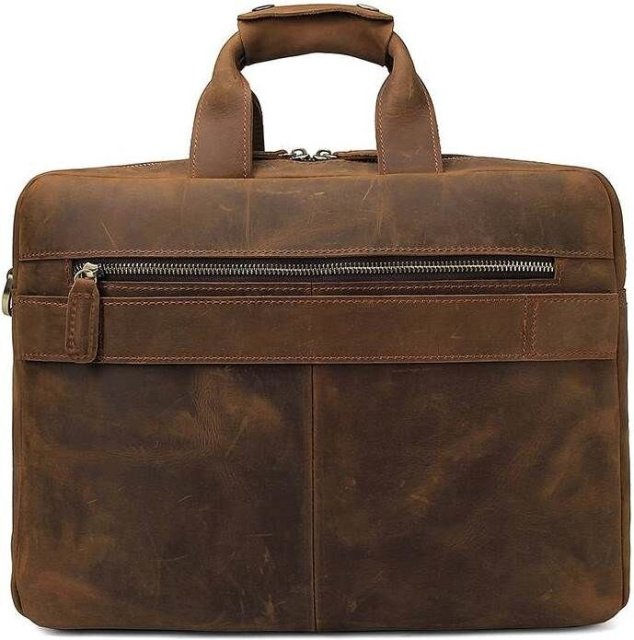 Функциональная сумка коричневого цвета, из качественной натуральной винтажной кожи. Цвет фурнитуры: латунь. На лицевой стороне находятся два накладных кармана, под клапаном, что закрывается двумя магнитами. На клапане находится карман на молнии. На задней внешней стороне расположено большое отделение на молнии, а также пришитый кожаный ремень, который можно повесить на выдвижную ручку чемодана. Подкладка выполнена из прочного текстильного материала темно-коричневого цвета.