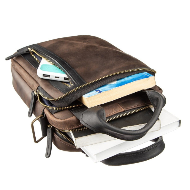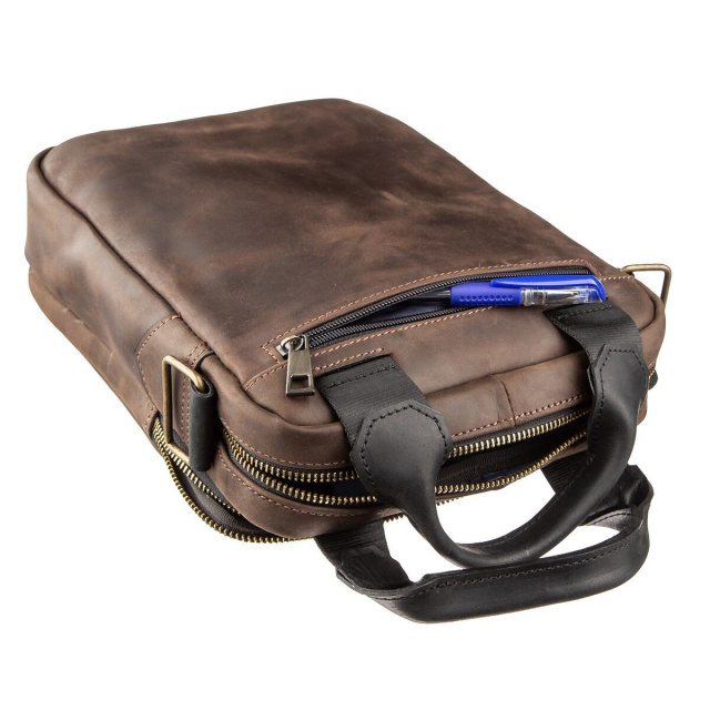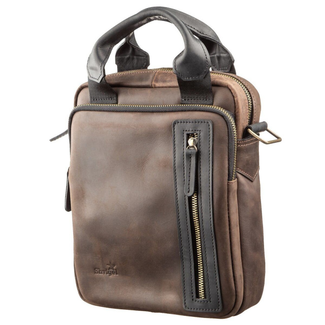 Новинка от украинского производителя Shvigel в сочетании двух популярных цветов. Аксессуар выполнен из натуральной телячьей кожи высочайшего качества. Внутри сумки крепкая текстильная подкладка синего цвета. Такая сумка очень удобна для работы или встреч. В нее прекрасно вместится планшет и все необходимое на каждый день. Есть 2 варианта носки сумки: в руках с помощью соответствующих кожаных ручек и на плече при помощи съемного ремешка. Аксессуар будет прекрасным вариантом для тех, кто водит машину, так как модель очень удобно доставать и она не затирается. Сумка дополнена золотистой фурнитурой. Модель выполнена в коже Crazy horse.