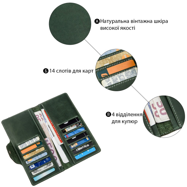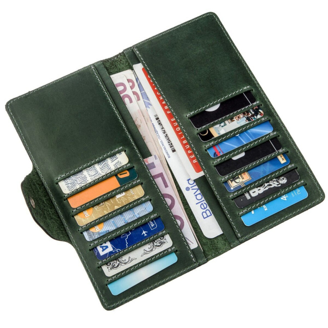 Цвет: зеленый; Материал: натуральная винтажная кожа высокого качества; Размеры (ШхВ, см): 18х8,5х1; Страна производитель: Украина. Внутри: - 4