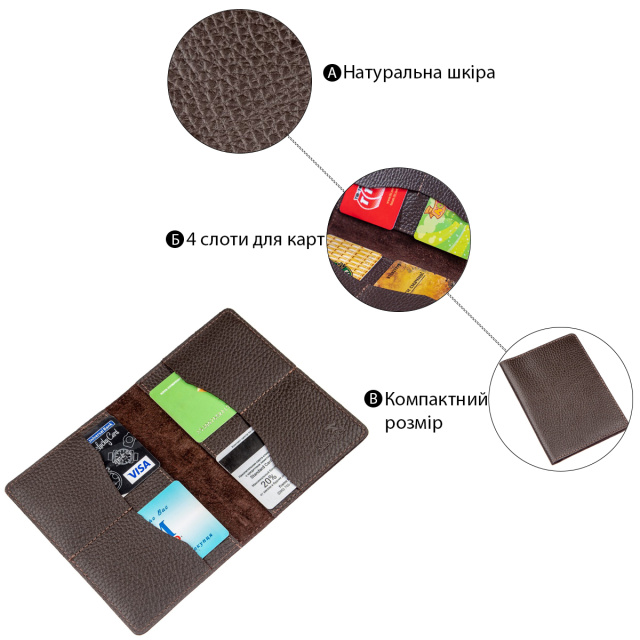 Компактная и мягкая обложка-бумажник из натуральной кожи, приятной и мягкой на ощупь. Аксессуар выполнен в коже флотар коричневого цвета. Внутри имеется тиснение Shvigel. Дополнена 4 слотами для кредиток или ID карты или прав. Такая обложка будет прекрасным подарком для самого близкого человека.
