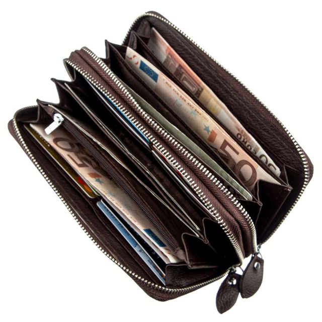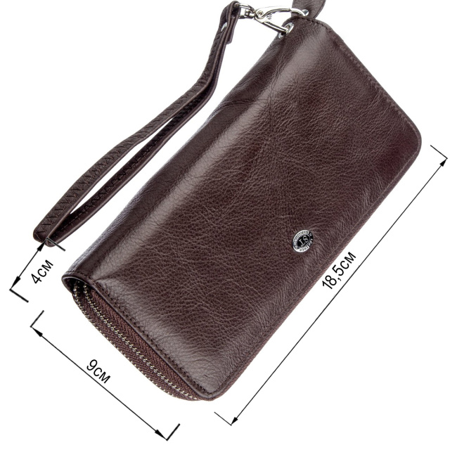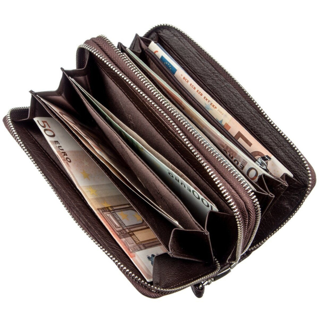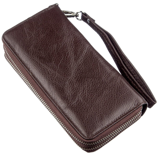 Удобный и многофункциональный клатч для деловых и предприимчивых людей. Выполнен из мягкой первоклассной натуральной кожи высокого качества. Цвет изделия – темно-коричневый. Отлично подходит как для женщин, так и для мужчин. Имеет два автономных отделения, каждое из которых закрывается на молнию. Внутри есть много отделений для купюр, документов и мелочи, для которой предусмотрено отделение на молнии. Также есть карманы для визитных и кредитных карт. Данный клатч вполне может заменить небольшую сумку. Для удобства использования также предусмотрен съёмный кистевой ремень. Упакован аксессуар в белую плотную картонную коробку с фирменным логотипом.