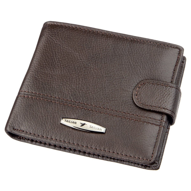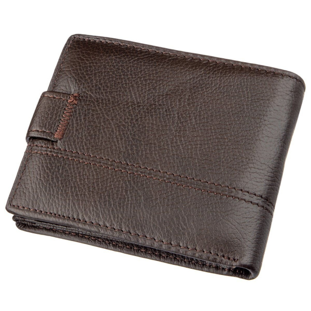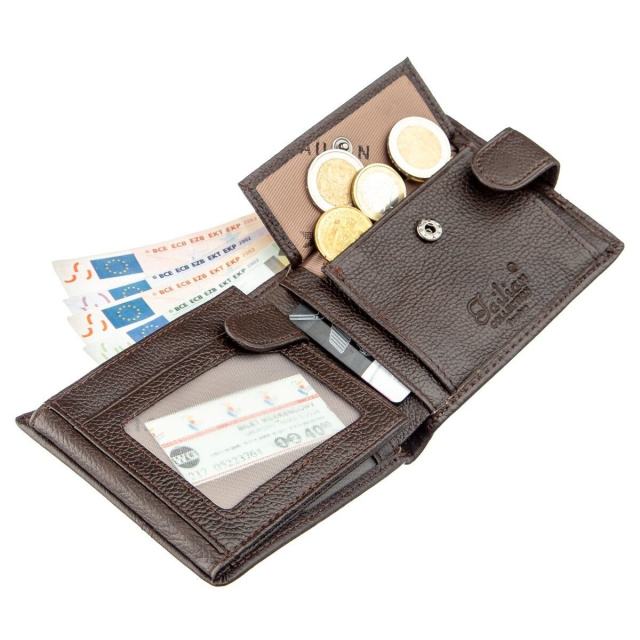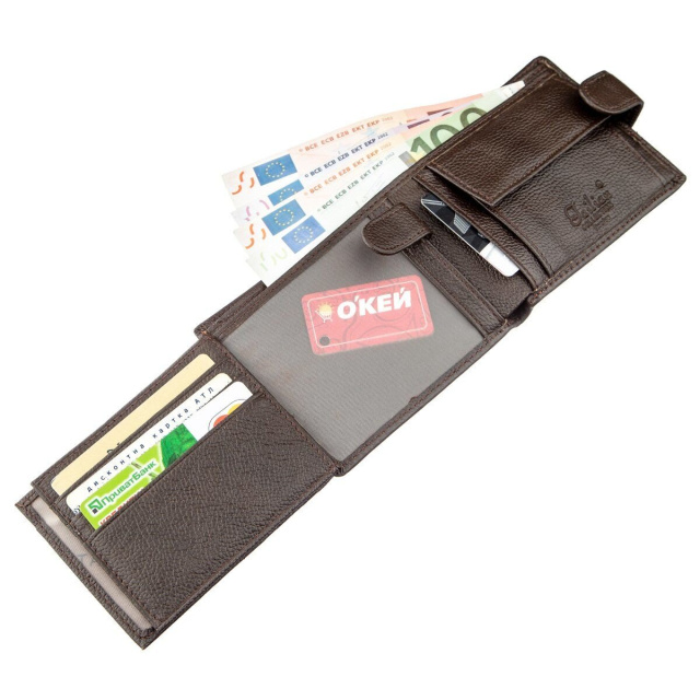 Горизонтальный кожаный мужской кошелек из натуральной кожи. Модель кошелька с монетницей на кнопке и тремя прозрачными ячейками в виде соответствующих вкладышей под прозрачной пленкой. Кошелек не занимает много места и легко поместится в мужскую сумку. Модель подойдет для всех типов купюр. По краям аксессуар прошит ровной строчкой. Внутри модель выполнена из кожи в сочетании с текстильной подкладкой коричневого цвета.