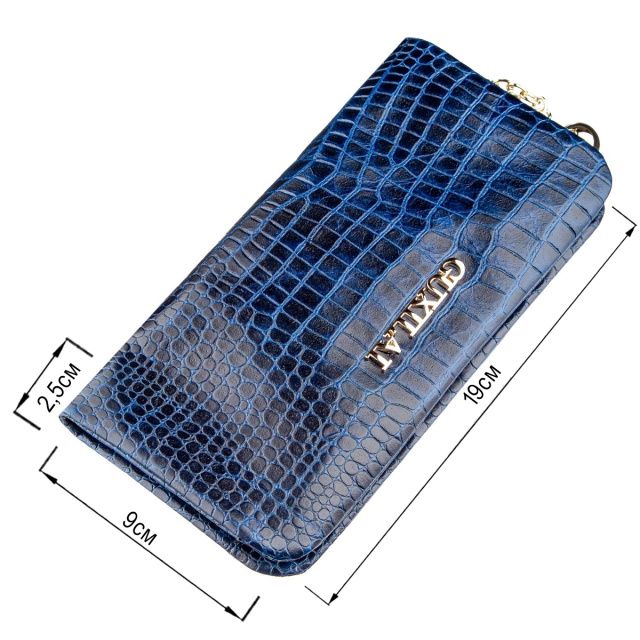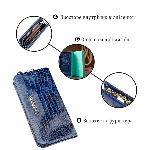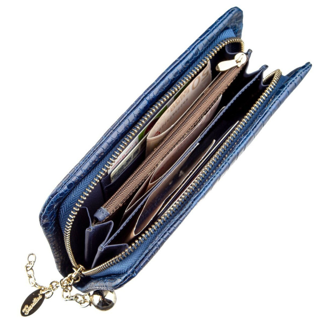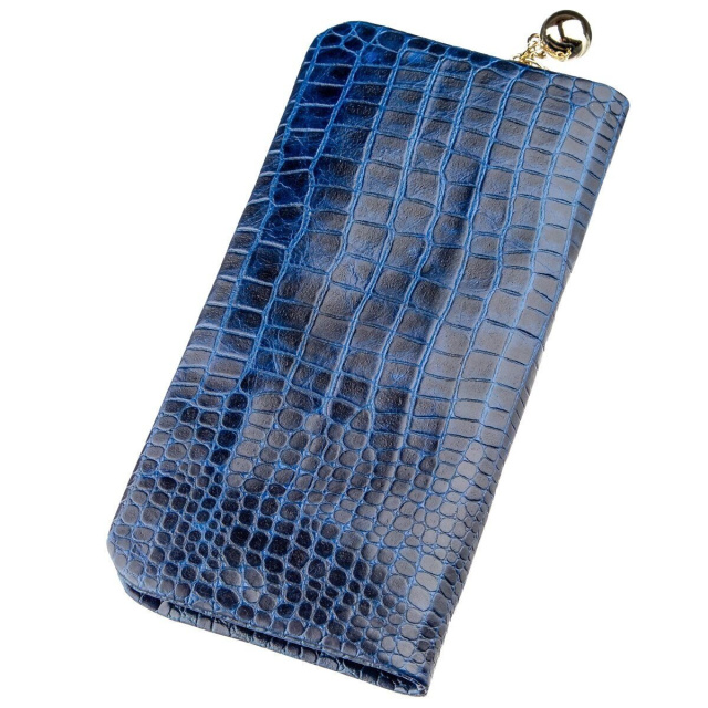 Синий женский кошелек с тиснением под кожу змеи. Модель мягкая и приятная на ощупь. Оригинальный дизайн модели оценит любая девушка. Кошелек компактный, а дизайн изделия продуман до самих мелочей. Внутри кошелька просторные отделения для купюр, ячейки для карточек и открытые карманы. Аксессуар будет прекрасным подарком для любой девушки. В комплекте к изделию идет картонная коробка мятного цвета.