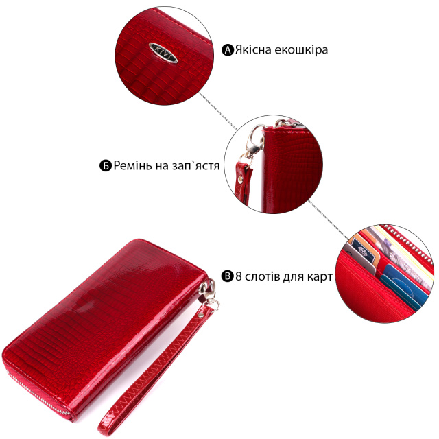 Данная модель яркого красного цвета. Изюминкой модели будет то, что аксессуар переливается на солнце. Изделие имеет оптимальный функционал для каждой девушки. В комплекте к кошельку идет ремешок-петелька на запястье. Красный кошелек выделит вас из толпы и подчеркнет ваше чувство стиля. Аксессуар выполнен из экокожи. Внутри изделие изготовлено из экокожи и прочного текстиля. Если вы ищете доступный кошелек советуем присмотреться к этой модели.