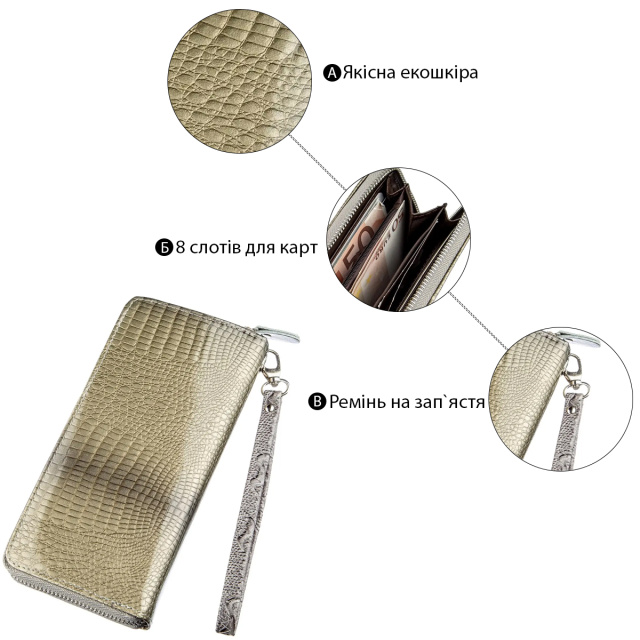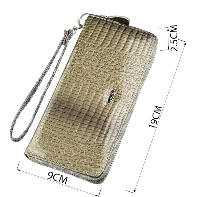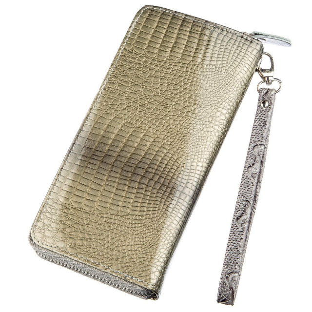 Данная модель оригинального серого цвета. Изюминкой модели будет то, что аксессуар переливается на солнце. Изделие имеет оптимальный функционал для каждой девушки. В комплекте к кошельку идет ремешок-петелька на запястье. Красный кошелек выделит вас из толпы и подчеркнет ваше чувство стиля. Аксессуар выполнен из экокожи. Внутри изделие изготовлено из экокожи и прочного текстиля. Если вы ищете доступный кошелек советуем присмотреться к этой модели.