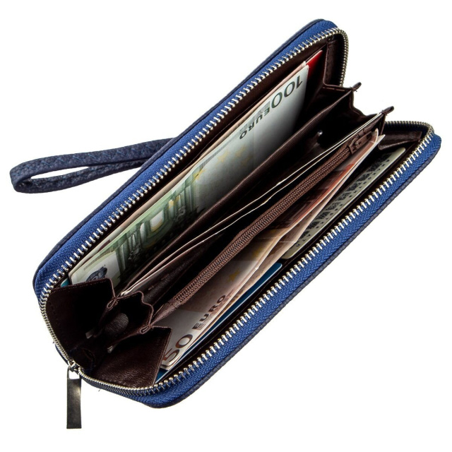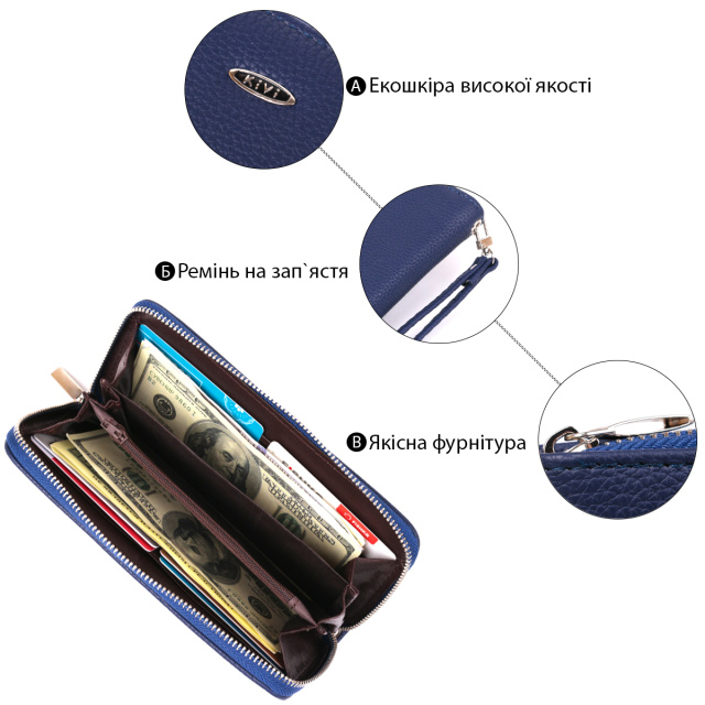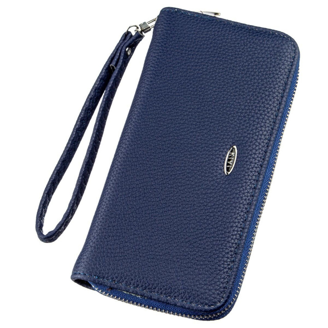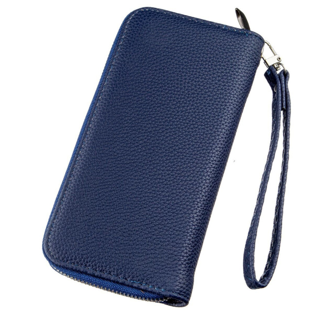 Спокойный синий цвет уже давно завоевал свою популярность наравне с черным и коричневым. Аксессуар выполнен из экокожи с мелкой зернистостью. Такой тип кожи очень хорошо носится и не проблематичен в уходе. По краям аксессуар прошит ровной строчкой в дизайн изделия. Каждая деталь кошелька была продумана опытными технологами для вашего удобства. Внутри аксессуара ремешок-петелька на запястье и ваш кошелек превратится в стильный клатч с которым вы можете пойти на вечеринку. Изделие станет прекрасным подарком для любой девушки.