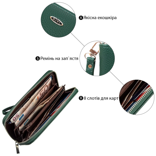 Кошелек на одно отделение из качественной экокожи. Аксессуар имеет мелкое тиснение. Внутри кошелька есть ремешок-петелька на запястье. Особенностью является то, что вы можете носить кошелек как в сумочке, так и на запястье. Кошелек горизонтального типа совсем не прихотлив в уходе и достаточно долго носится. Если вы ищете недорогой, но при этом достойный кошелек – советуем присмотреться к этой модели. Она станет прекрасным подарком для близкого человека. Аксессуар упакован в прозрачный пакет.