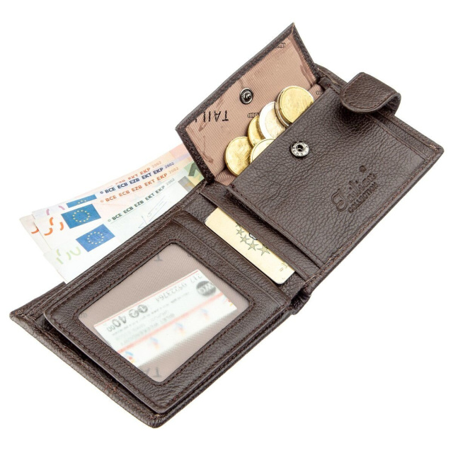 Данная классическая модель портмоне для мужчин имеет специальный внутренний вкладыш с двумя отделами под прозрачной пленкой для карточек. Бумажник изготовлен из натуральной темно коричневой говяжьей кожи. Внутри кошелька есть весь необходимый функционал для вашего комфорта. Для внутренней отделки использована натуральная свиная кожа и высококачественный текстиль. В нашем интернет-магазине bag24.com.ua вы можете ознакомиться с широким ассортиментом кожаных мужских кошельков.