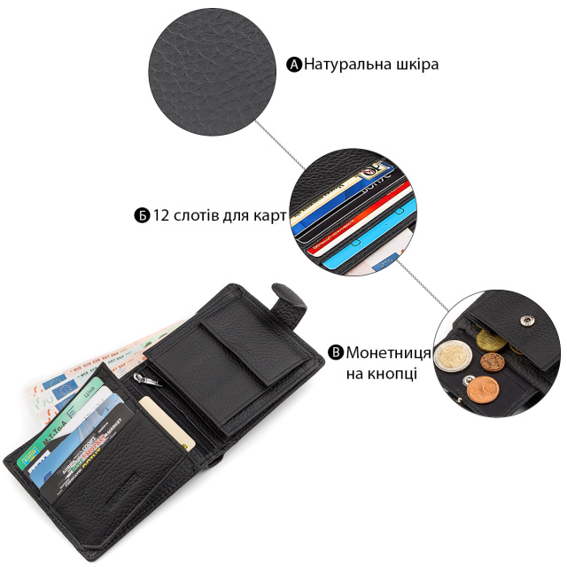 Материал: натуральная кожа; Цвет: черный; Размеры (ШхВхГ): 12х10,5х3; Страна производства: Китай. Особенности 2 отделения для банкнот; 12...