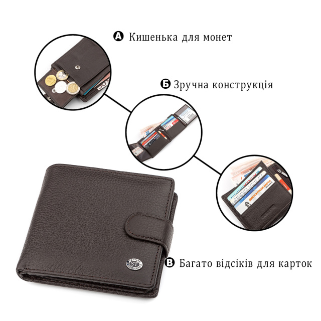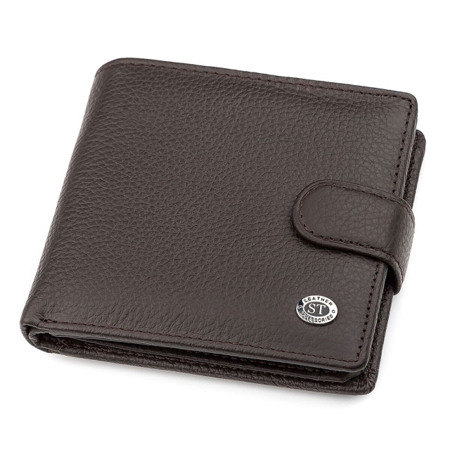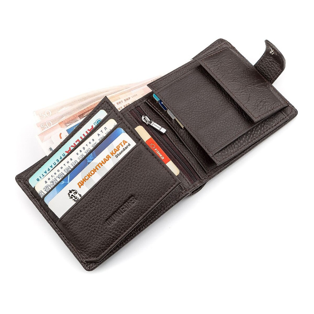 Функциональность данной модели мужского аксессуара из кожи является фиксация с использованием цупферной застежки. Купюры можно хранить в специальных отделениях, из которых деньги не выглядывают, и кредитки, в предусмотренных отсеках. В специальных отсеках с окошками можно хранить права или удостоверение. Для монет предусмотрен специальный карман на кнопке.
