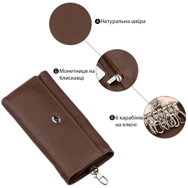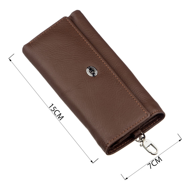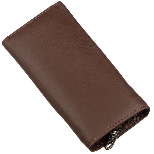 Элегантная ключница для мужчин, которая легко выполняет функции мини-бумажника. Сделана из высококачественной кожи стильного коричневого цвета. Имеет полноценное отделение для купюр, а также отделение на молнии для других ценных вещей. Если Вы по своей натуре минималист и не любите большие громоздкие кошельки, но при этом Вам необходимо с собой всегда иметь деньги, ключи и прочие мелочи, то данный аксессуар просто идеально подходит под эти требования. Также бумажник-ключница имеет крючок, чтобы прицепить его или на пояс, или на любой другой аксессуар. Упаковано данное изделие в плотную картонную коробку белого цвета.