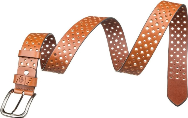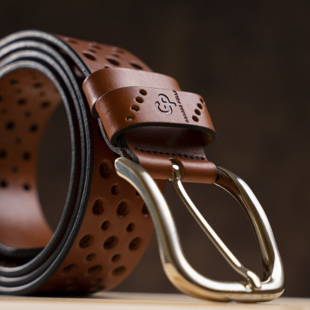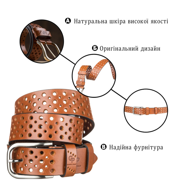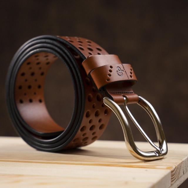 Стильный ремень из цельной итальянской кожи, модель подойдет как мужчинам, так и женщинам. Необычное полотно перфорировано отверстиями разных диаметров, что придает изделию изысканности и неповторимости. Края изделия оформлены черным цветом, что придает ему оригинальности. Производитель, использует исключительно импортную фурнитуру, которая не темнеет, не царапается и не вызывает аллергии.