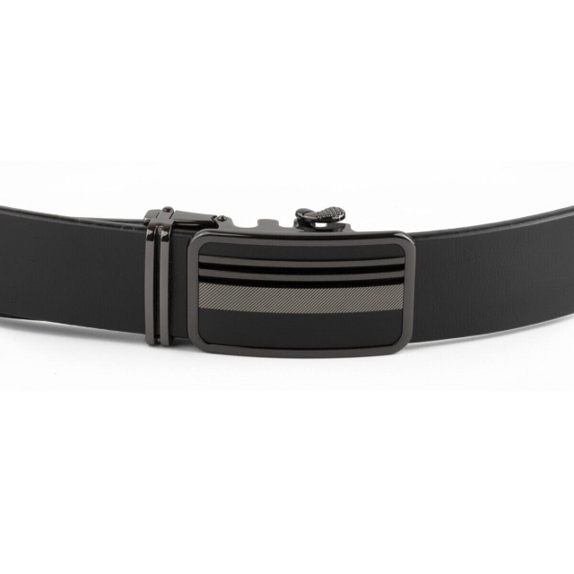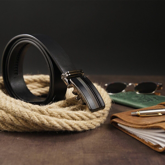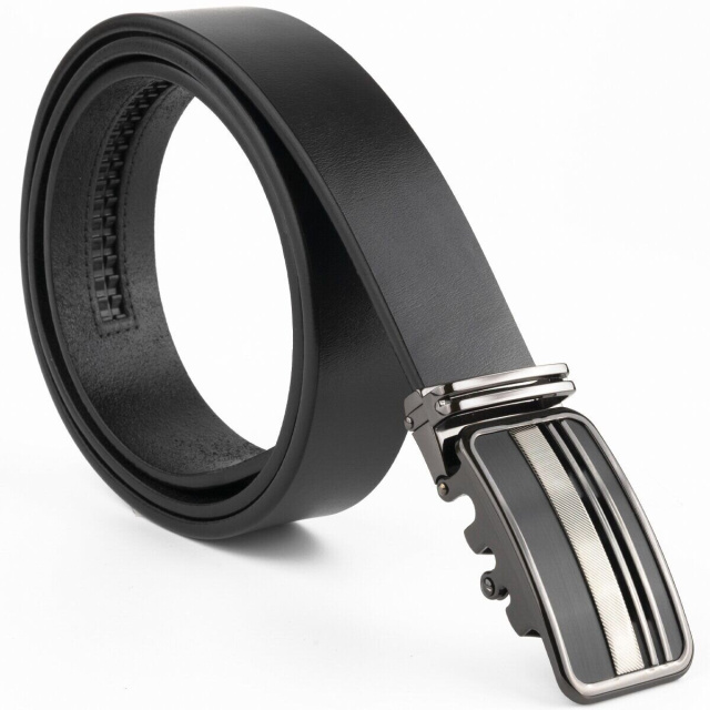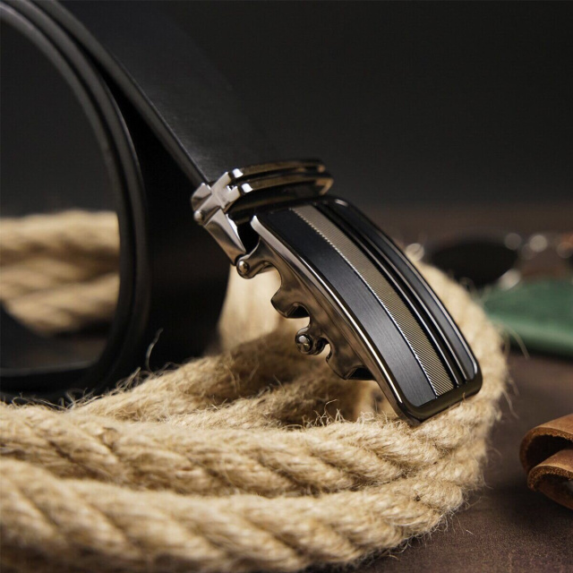Качественный ремешок из натуральной кожи и цельного полотна. Модель дополнена оригинальной пряжкой, которая сочетает в себе затемненный металл и серебристые полоски. Пряжка придает ремешку особенного шарма и добавляет индивидуальности. Ремень подойдет под джинсы и брюки. Пряжка автомат очень удобная и долгое время не выходит из строя. Если вы в поисках качественного ремня - рекомендуем вам данную модель. А также вы можете приобрести ремешок на подарок мужчине. Уверены, что изделие не оставит его равнодушным.