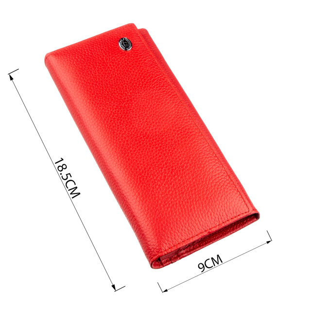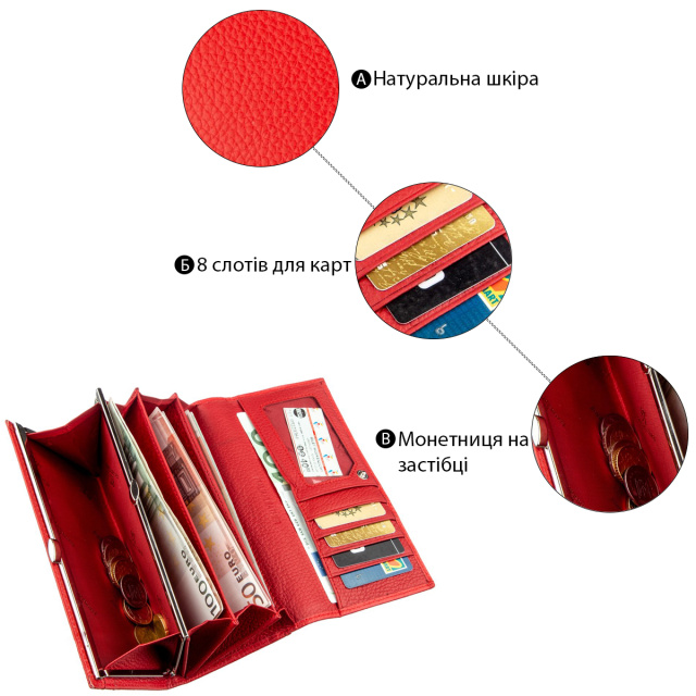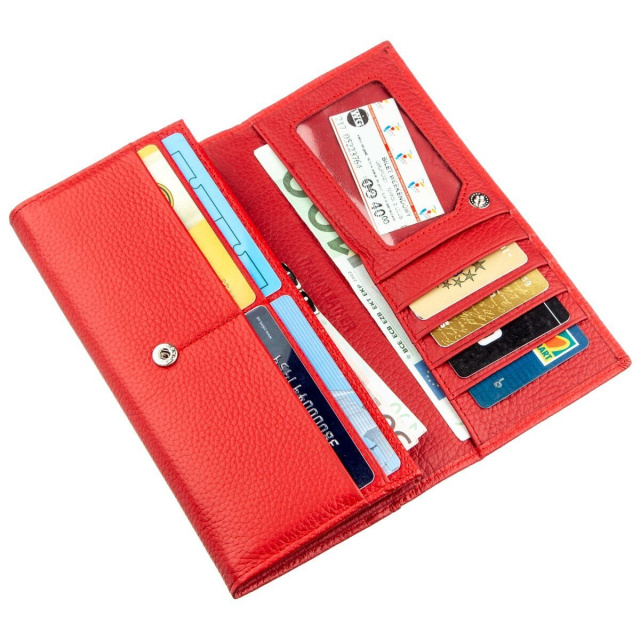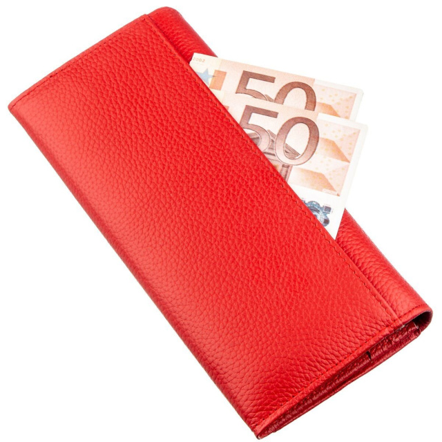 Эффектный женский кошелек для ярких и незаурядных личностей. Материал изготовления – высокопробная натуральная кожа с зернистой фактурой, на ощупь мягкая и приятная. Изюминкой кошелька является его насыщенный красный цвет с матовым оттенком. Внутри аксессуара присутствует много различных отделений, а именно: три больших отделения для купюр и банкнот, монетница на защелке, отделение на молнии по всей длине, восемь карманов для различных визиток и банковских карт. На тыльной стороне есть еще одно большое скрытое отделение. Упакован кошелек в твердую картонную коробку.