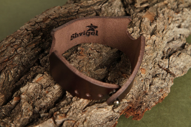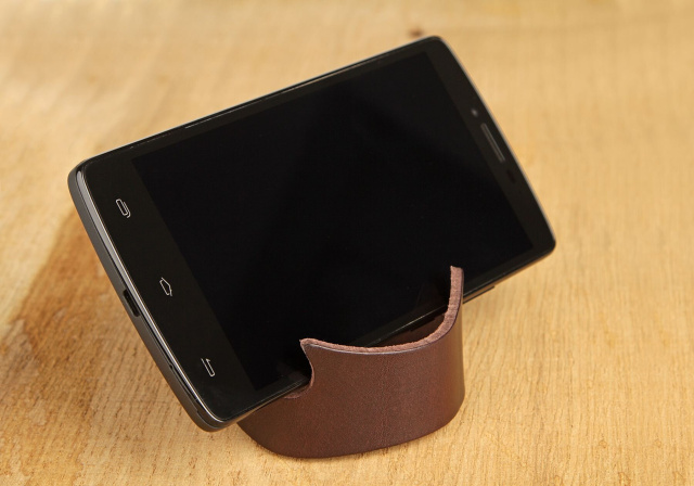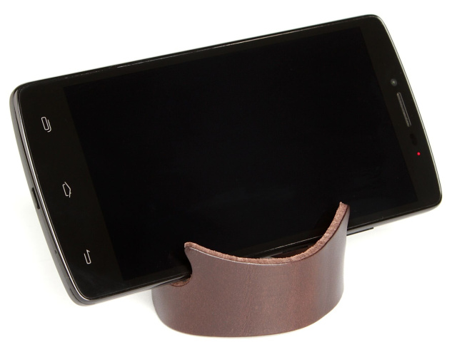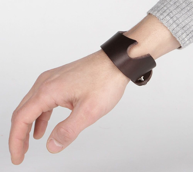 Кожаный браслет оригинально смотрится на руке. Аксессуар можно использовать в качестве подставки для смартфона.