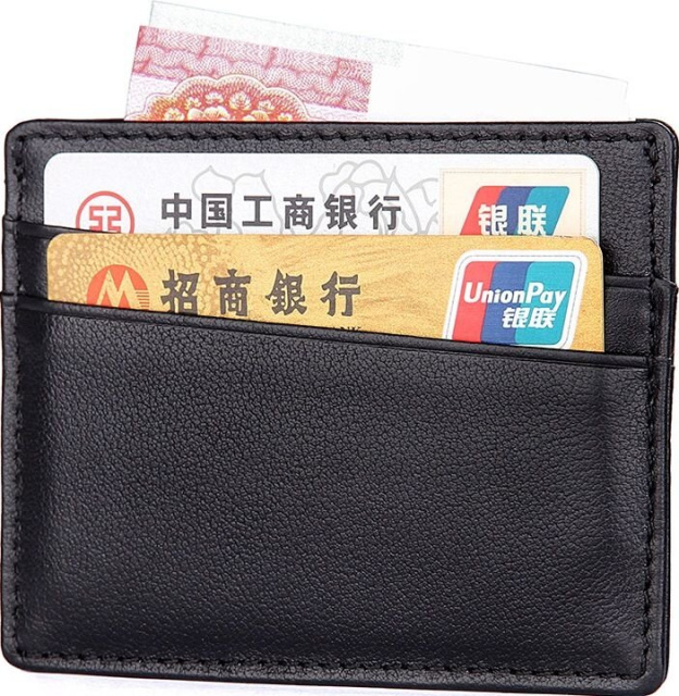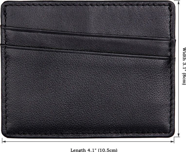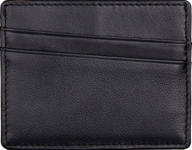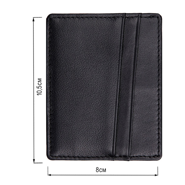 Компактная кожаная кредитница из натуральной кожи черного цвета, без застежки. Такой аксессуар выглядит очень элегантно и может использоваться для хранения купюр. Кредитница упакована в текстильный пылезащитный чехол.