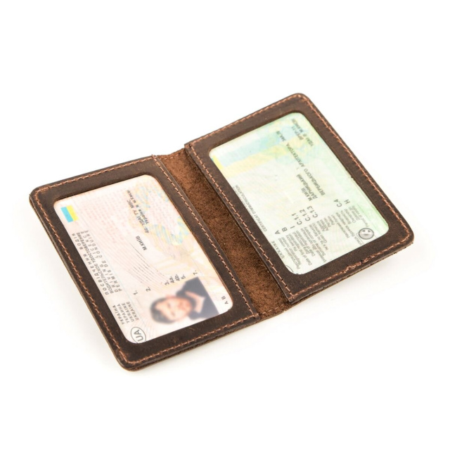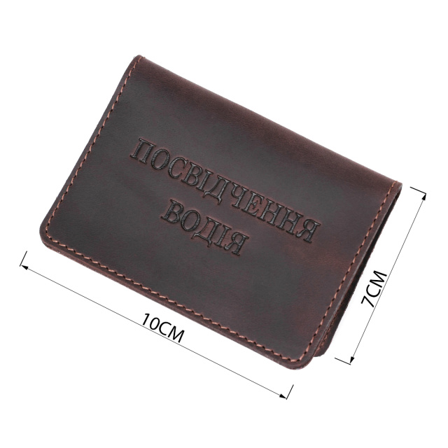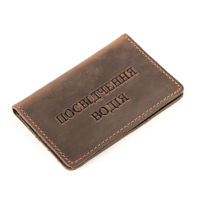 Компактная и практичная обложка для водительских прав из натуральной винтажной кожи, характерными признаками которой являются потертости и неоднородность окраса.