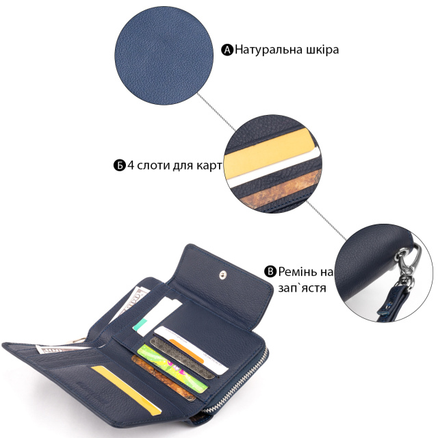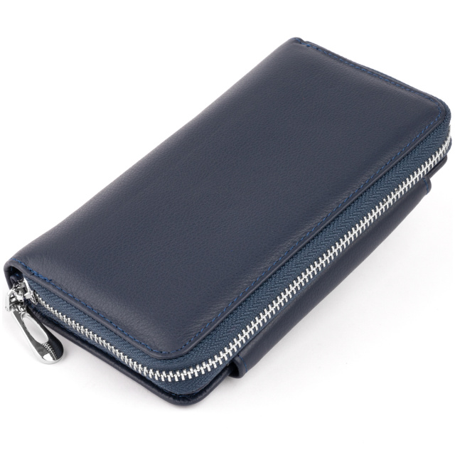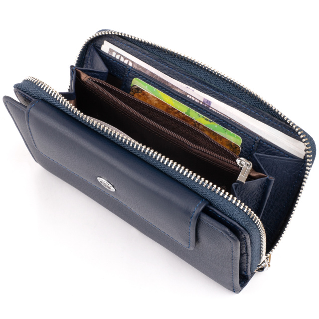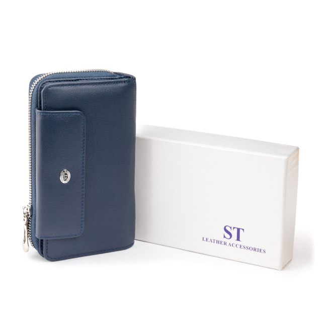 Презентабельный женский кошелек из натуральной кожи, темно-синего цвета. Он имеет много различных отделений и карманов, поэтому можете не переживать, ведь в него поместятся все ваши необходимые вещи. Функциональность данной модели не уступает дорогим брендовым и качество достойное. Его можно носить в сумке, портфеле, а также как самостоятельный аксессуар. Внутри кошелька достаточно места для удобного расположения купюр, кредиток и других личных вещей. Спешите купить клатч для себя или на подарок близкому человеку. При покупке кошелька, он будет упакован в фирменную картонную коробку белого цвета. Рекомендуем вам данную модель, если вы хотите отменный аксессуар за доступные деньги.