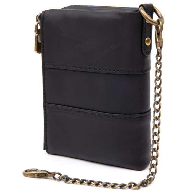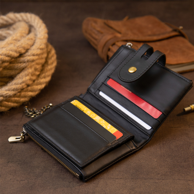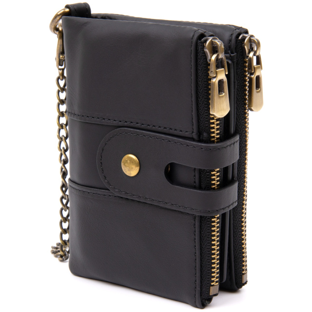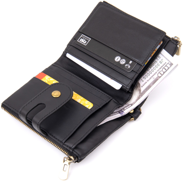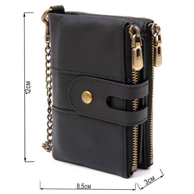 Компактный и очень функциональный кошелек из натуральной кожи в черном цвете. Уникальной особенностью такого кошелька является то, что вы сами можете регулировать объем наполненности кошелька. В аксессуаре 2 кнопочки. Огромный функционал впечатлит любого клиента. Кошелек совсем не прихотлив в использовании. И отлично носится годами. С таким функциональным кошельком вы точно ничего не забудете. Вы также можете носить кошелек на цепочке. Может быть прекрасным подарком для близкого человека.