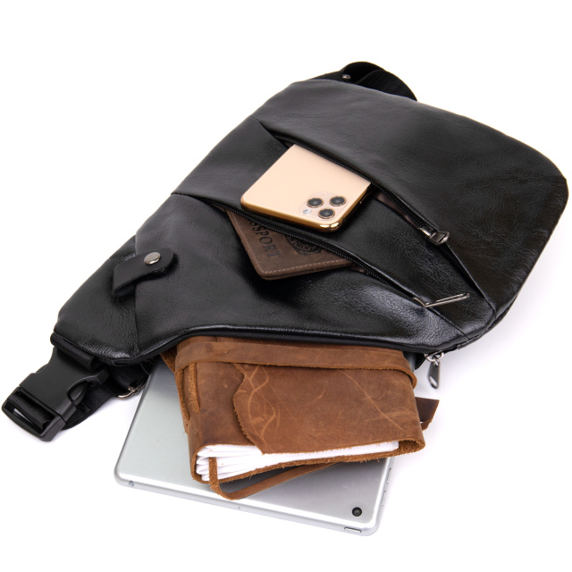 Очень компактная сумка из качественного кожзама классического черного цвета, который подходит под любую обувь и гардероб. Идеальная текстильная сумка для ежедневного использования и поездок. Сумка тонкая и очень эргономичная. Изделие продумано с учетом всех тенденций под практичного современного мужчину. С сумкой слинг все ваши личные вещи будут в безопасности и перед вашими глазами. Предшественницей сумки слинг является сумка кобура. Именно она была создана как сумка чехол для ношения оружия. Функционал и расположение карманов данной сумки делает более легким доступ к вашим личным вещам. Также сумка с легкостью может быть спрятана под плечом, что обеспечит большую защиту от воров и ваши ценные вещи будут перед вашими глазами и в полном порядке. Сумка-слинг станет прекрасным подарком для ваших близких.