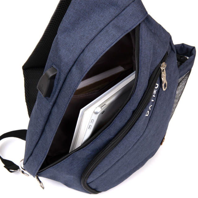 Вместительная сумка среднего размера из плотного текстиля синего цвета. Идеальный вариант для ежедневного использования и поездок. Сумка подойдет как для мужчин так и для женщин. Изделие заменит вам рюкзак и освободит ваши руки. При этом сумка имеет очень легкий вес. Изделие продумано с учетом всех тенденций. С сумкой через плечо все ваши личные вещи будут в безопасности и перед вашими глазами. Функционал и расположение карманов данной сумки делает более легким доступ к вашим личным вещам. Данная модель имеет достаточно карманов для того чтобы разложить все ваши вещи в полном порядке и вместить в нее по-максимуму. Сумка через плечо станет прекрасным подарком для ваших близких. На тыльной стороне аксессуара уплотненная спинка в сетку. В комплекте идет шнур.
