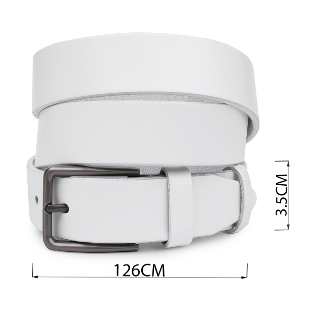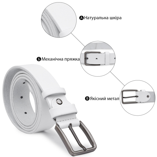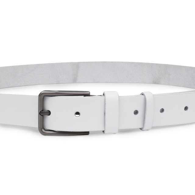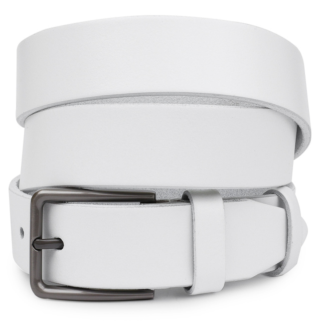 Замечательный ремень для тех, кто ищет аксессуар белого цвета. Выполнено изделие из натуральной высококачественной кожи с гладкой приятной на ощупь фактурой. Пряжка имеет стандартный строгий дизайн и классический надежный механизм. Такой ремень хорошо подойдет под любой вид одежды и сделает хороший акцент в Вашем образе.