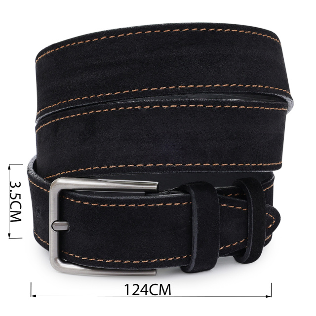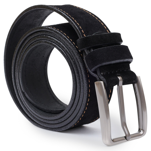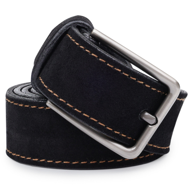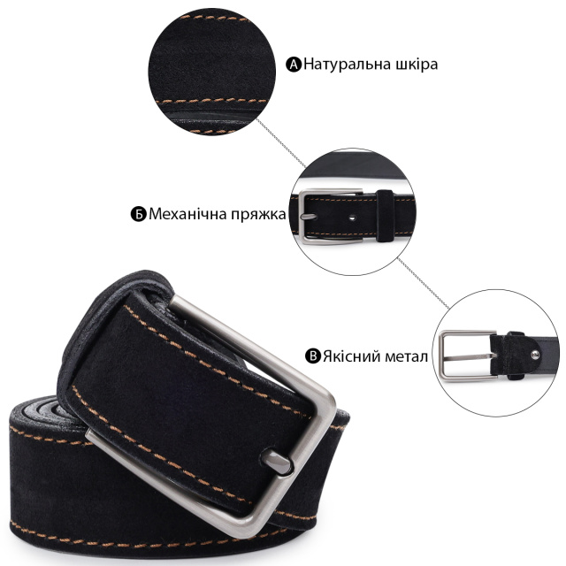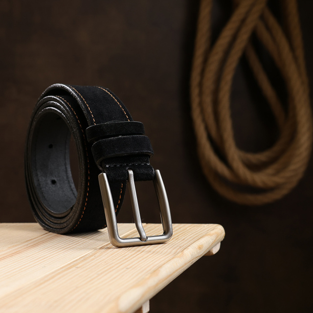 Красивый замшевый ремень от известного украинского производителя. Имеет насыщенный черный цвет и светло-коричневые строчки по краям. Материал изготовления – натуральная кожа высокого качества и стойкости к повреждениям. Пряжка ремня имеет простой и лаконичный дизайн с классическим механизмом.
