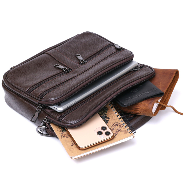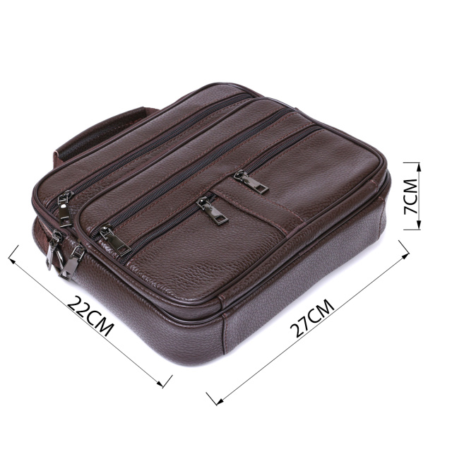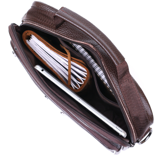 Практичная мужская сумка-органайзер из высококачественной натуральной кожи с высокими показателями прочности. Имеет просторное основное отделение и множество карманов разного размера. Данная модель отлично подойдет тем деловым людям, которые носят с собой много мелких вещей и пытаются их упорядочить. Цвет изделия – коричневый, фактура – зернистая.