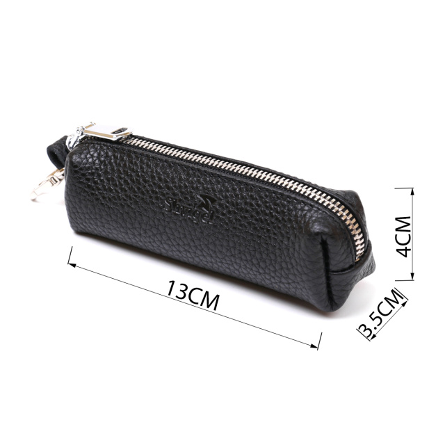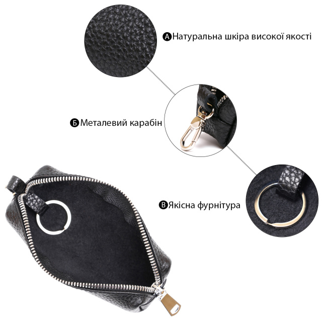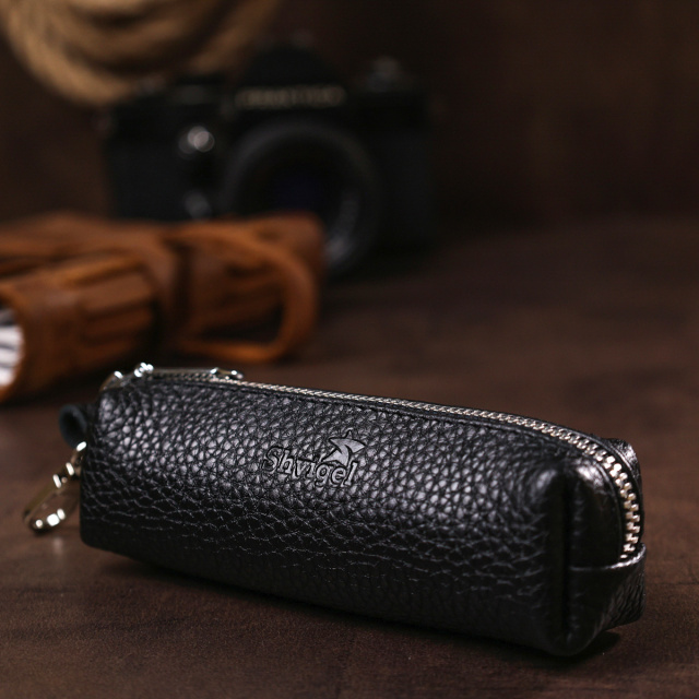 Отличная ключница для безопасного хранения ключей, при этом они точно не поцарапают содержимое сумки или кармана. Выполнено изделие из натуральной кожи высокого класса с улучшенными показателями стойкости к износу. Ключи крепятся на металлическое кольцо внутри изделия, сам аксессуар закрывается на молнию. Цвет – классический черный.