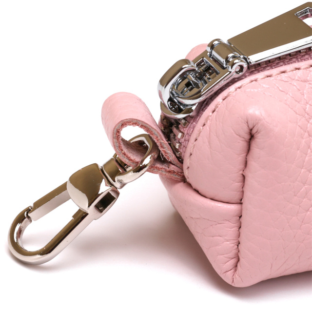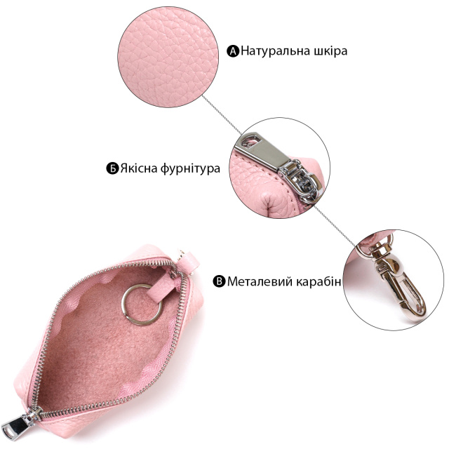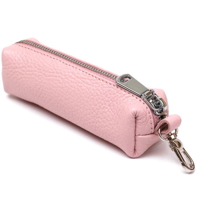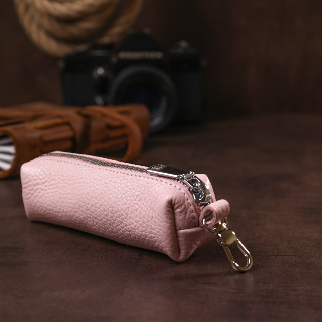 Отличная женская ключница от украинского производителя. Выполнена модель в нежном розовом цвете, имеет зернистую фактуру и очень мягкую кожу. Материал – натуральная кожа с улучшенными показателями прочности к износу. Внутри расположено металлическое кольцо для крепления ключей.