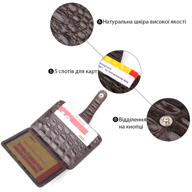 Интересный картхолдер из натуральной кожи с тиснением под крокодила, в коричневом цвете. При закрытии, разворот фиксируется на хлястик с кнопкой. На лицевой стороне в виде декора расположен металлический логотип производителя.  Аксессуар упакован в фирменную коробочку. Изделия из натуральной кожи всегда будут отличным подарком для близкого человека.