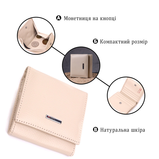 Удобный компактный женский кошелек из натуральной кожи высокого качества. Внутри есть отделение для купюр, шесть ячеек для кредитных карт, необычная монетница и скрытый один карман. В изделии использована качественная фурнитура, а также прочная фирменная подкладка. Не большой кожаный кошелек поместится даже в самую маленькую сумочку. Закрывается модель в два сложения на кнопку. Такой кошелек, однозначно, порадует любую женщину.