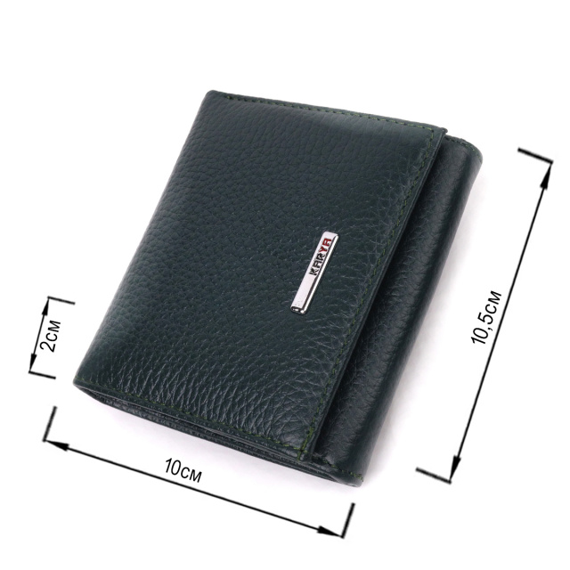 Интересный компактный женский кошелек из натуральной кожи высокого качества. Внутри есть отделение для купюр, шесть ячеек для кредитных карт, необычная монетница и скрытый один карман. В изделии использована качественная фурнитура, а также прочная фирменная подкладка. Не большой кожаный кошелек поместится даже в самую маленькую сумочку. Закрывается модель в два сложения на кнопку. Такой кошелек, однозначно, порадует любую женщину.