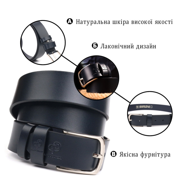 Отличный ремень под джинсы, синего цвета из натуральной итальянской кожи, от украинского производителя. Хороший ремень способен идеально завершить образ и подчеркнуть ваш статус. Ремень изготовлен из цельного полотна кожи. Аксессуар имеет гладкую фактуру, аккуратно пошит, длина регулируется в меньшую сторону. Дополнен ремешок серебристой пряжкой с закругленными углами. Кожаный ремешок один из самых удачных и нужных подарков для любого мужчины.