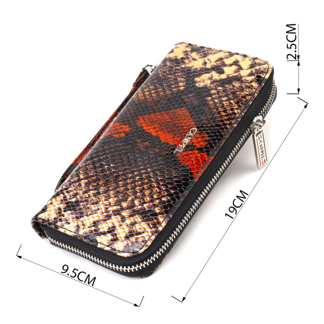 Превосходный женский кошелек, из натуральной фактурной кожи, с тиснением под змею. Аксессуар имеет три основных отделения, в которые помещаются купюры всех номиналов, две перегородки, одна из них на молнии, восемь карманов для карточек, два прилегающих кармана и съемный кистевой ремень. Закрывается аксессуар на молнию. Отличный аксессуар, надежного производителя, который прослужит очень долго.
