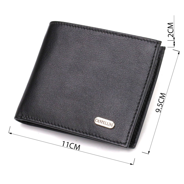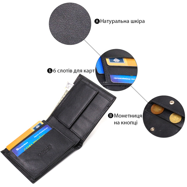 Вместительный мужской кошелек из натуральной гладкой кожи. Аксессуар имеет одно основное отделение с тканевой перегородкой в которое помещаются купюры всех номиналов, шесть карманов для карточек, карман под сеточкой для пропуска, один скрытый карман и монетницу. Закрывается аксессуар пополам, без застежки. На лицевой стороне, в правом нижнем углу металлический логотип компании производителя. Приобретая кожаный аксессуар этой фирмы, себе или на подарок, будьте уверены, что он прослужит Вам не один год.