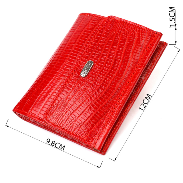 Интересный женский кошелек среднего размера из натуральной фактурной кожи с тиснением под рептилию. Аксессуар имеет одно основное отделение с тканевой перегородкой в которое помещаются купюры всех номиналов, пять карманов для карточек (один под сеточкой), два скрытых кармана и монетницу. Закрывается аксессуар в два сложения на кнопку. Приобретая кожаный аксессуар этой фирмы, себе или на подарок, будьте уверены, что он прослужит Вам не один год.