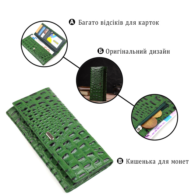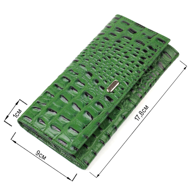 Интересный фактурный женский кошелек горизонтального типа из натуральной кожи с тиснением под крокодила. Аксессуар имеет одно основное отделение, шесть карманов для карточек (один под сеточкой), один скрытый карман, три прилегающих кармана и монетницу. Закрывается аксессуар клапаном на кнопку. Приобретая кожаный аксессуар этой фирмы, себе или на подарок, будьте уверены, что он прослужит Вам не один год.