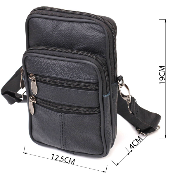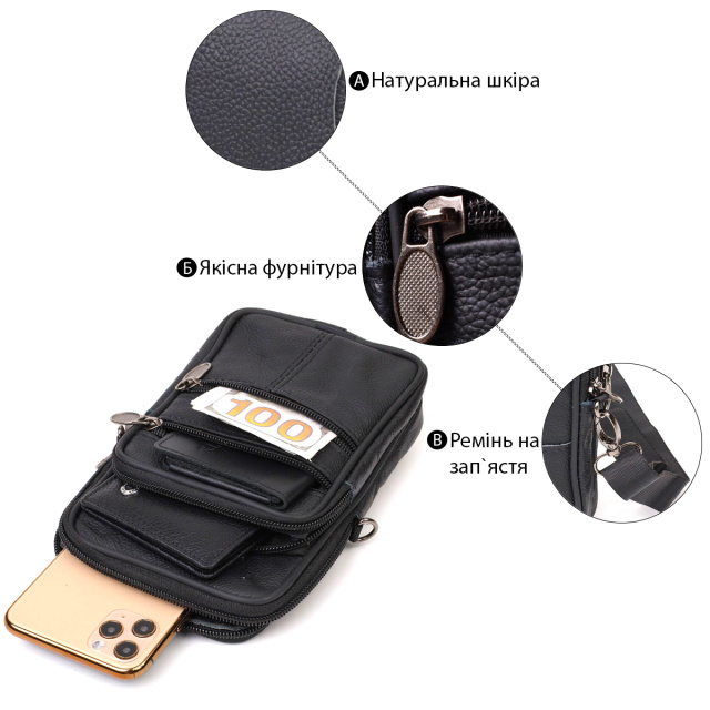 Маленькая вертикальная сумка на пояс из натуральной мягкой кожи. Аксессуар Вы сможете носить на поясе за петельку или на плече при помощи съемного текстильного ремешка. Изделие состоит из основного отделения и трех карманов разной величины. Аксессуар станет просто находкой в путешествиях или для водителей.