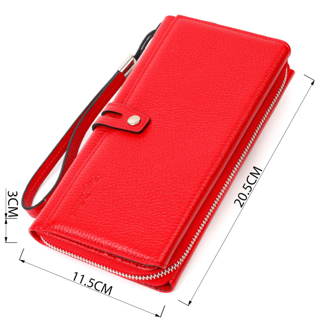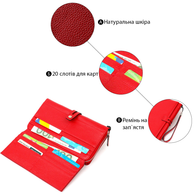 Вместительный клатч из натуральной кожи для женщин, стильных и уверенных в себе. Аксессуар состоит из вместительного отделения для купюр, в котором находится карман-перегородка на молнии, которую можно использовать как монетницу, двадцати ячеек для пластиковых карт, которые находятся в автономных блоках, четырех прилегающих карманов и съемного кистевого ремня. В изделии использована качественная фурнитура. Закрывается клатч на молнию - основное отделение и на хлястик с кнопкой - блоки для карт.