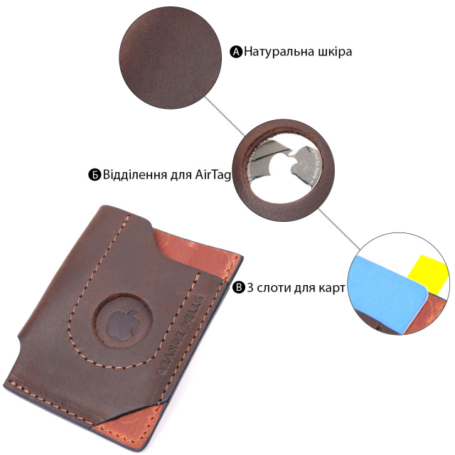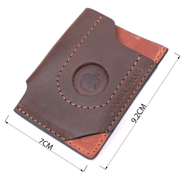 Компактный кожаный картхолдер ручной работы из натуральной высококлассной винтажной кожи. На лицевой стороне изделие имеет тисненый логотип производителя Grande Pelle. Аксессуар состоит из трех отделений под карточки. Кроме удобного функционала фишкой этого картхолдера является держатель для смарт трекера Apple AirTag, это современное устройство определяющее местонахождение вещи к которой он прикреплен. Благодаря компактным размерам аксессуара он отлично помещается в кошелек, карман или сумку любого размера, что поможет пользователям легко найти потерянные или забытые вещи. Отличный аксессуар для современного человека. Внимание, смарт трекер Apple AirTag не идет в комплект с аксессуаром!