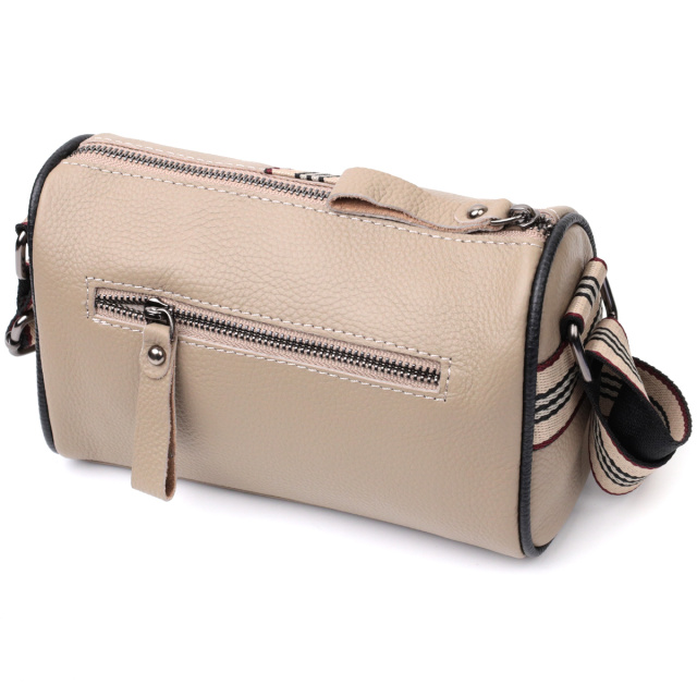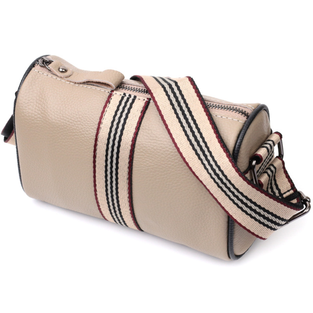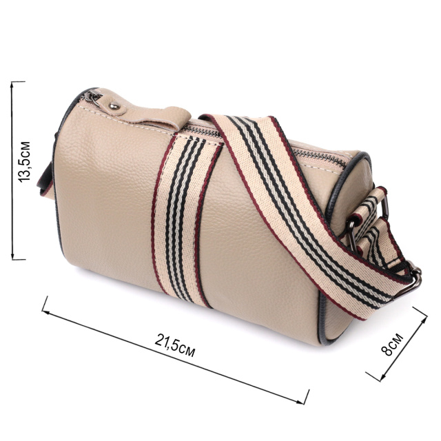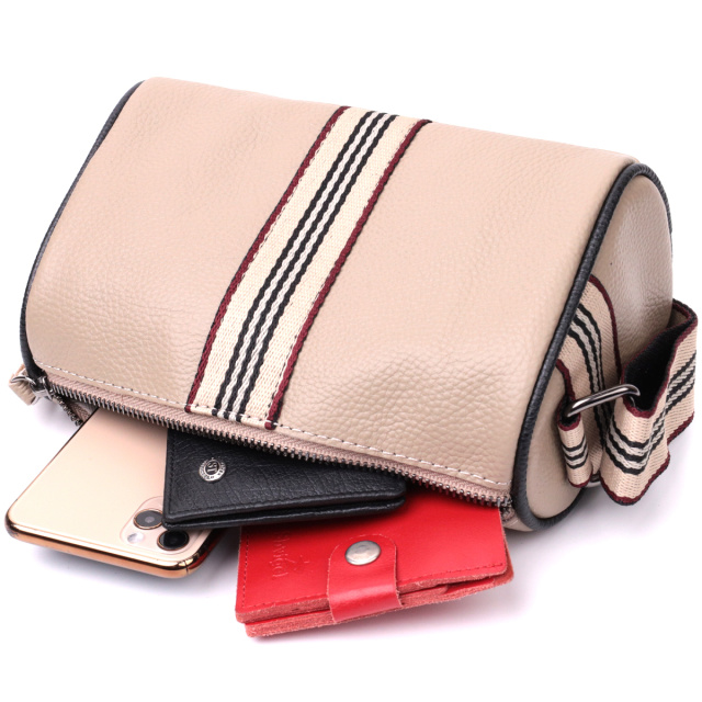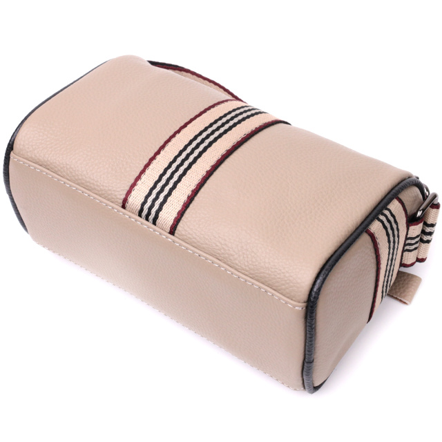 Интересная женская сумка в бежевом цвете из натуральной кожи с высоким показателем качества и износостойкости. Фишкой этого изделия является полоска ткани пришитая посредине в цвет плечевого ремня. Аксессуар состоит из одного отделения в котором карман на молнии и карман открытого типа, а также встроенного кармана на молнии, на тыльной стороне. Носить сумку можно на плече, через плечо. В изделии использована качественная фурнитура серебряного цвета.