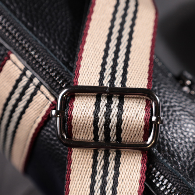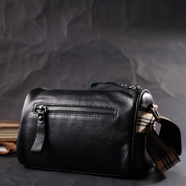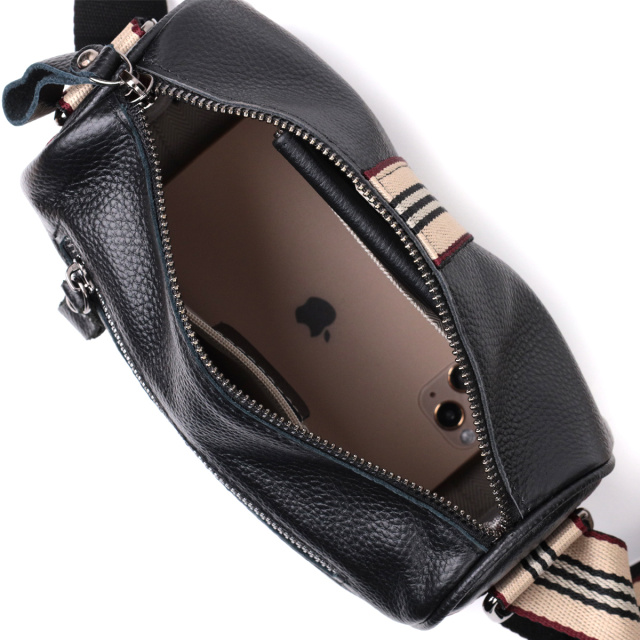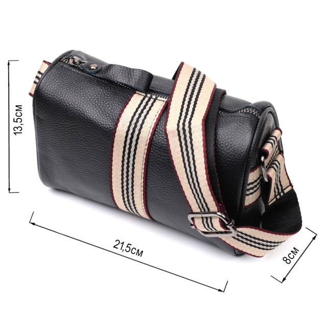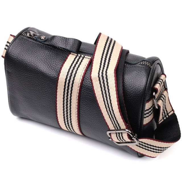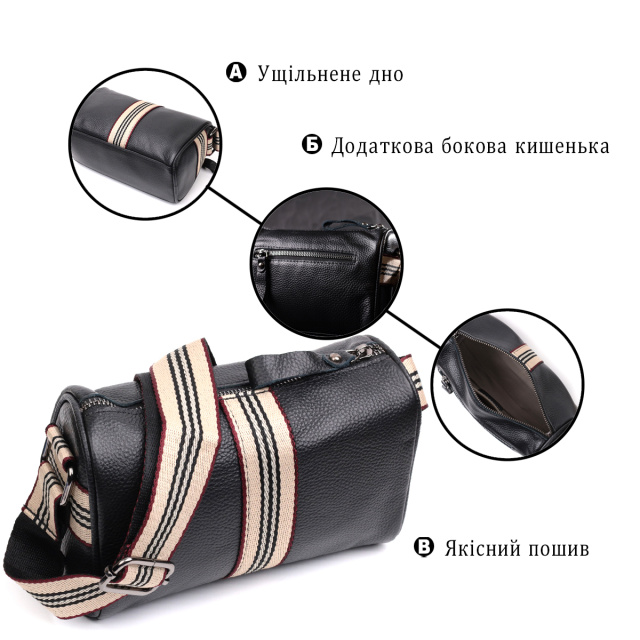 Привлекательная женская сумка в черном цвете из натуральной кожи с высоким показателем качества и износостойкости. Фишкой этого изделия является полоска ткани пришитая посредине в цвет плечевого ремня. Аксессуар состоит из одного отделения в котором карман на молнии и карман открытого типа, а также встроенного кармана на молнии, на тыльной стороне. Носить сумку можно на плече, через плечо. В изделии использована качественная фурнитура серебряного цвета.