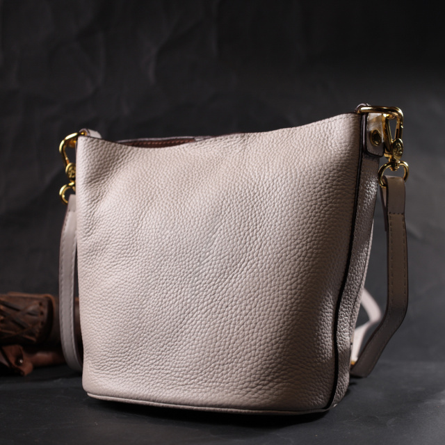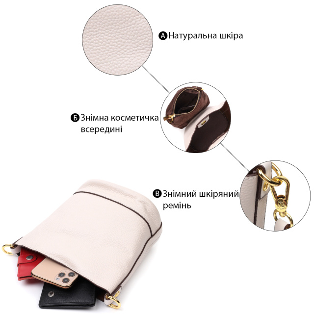 Удобная женская сумка с твердым дном, без подкладки и с косметичкой внутри. Изделие пошито из качественной натуральной кожи, которая долго носится и не теряет свой первоначальный вид. Аксессуар состоит из одного отделения в котором пристегивается косметичка, что закрывается на молнию. Носить сумку можно на плече и через плечо, для этого имеется кожаный съемный ремень. В изделии использована качественная фурнитура цвета желтого золота. Универсальный вариант сумки как на вечер так и в качестве сумочки на каждый день.