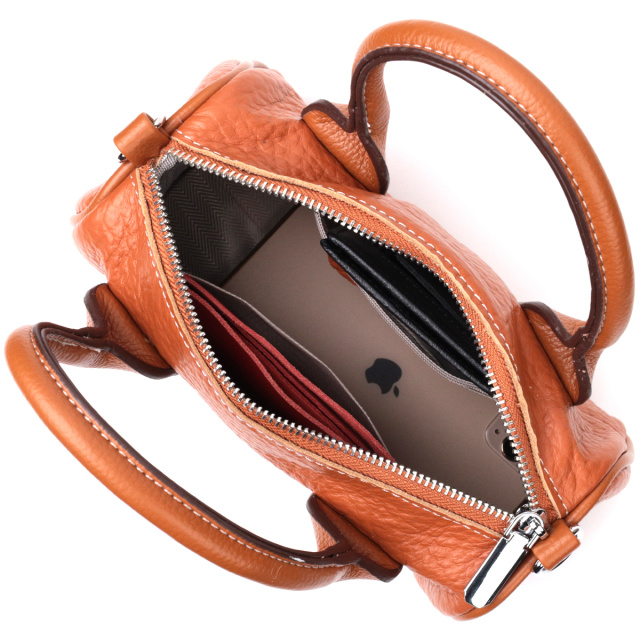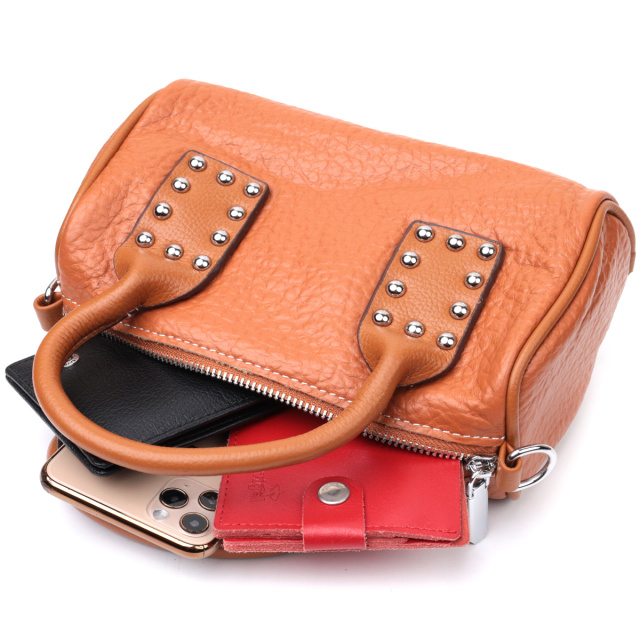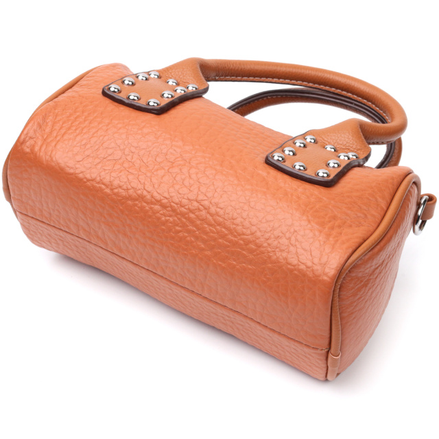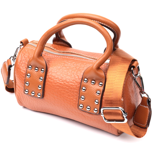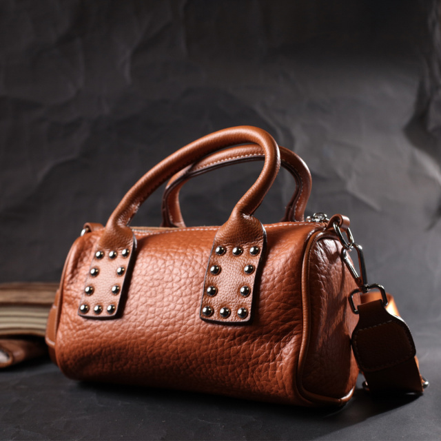 Красивая женская сумка-боченок из натуральной кожи. Акцентом данного изделия есть декоративный рисунок из металлических кнопок, в форме прямоугольников, который расположен у оснований ручек. Аксессуар состоит из одного отделения в котором находится потайной карман на молнии и карман открытого типа. Носить сумку можно в руке, для этого предусмотрены кожаные ручки, а также на плече и через плечо, для этого имеется текстильный съемный ремень. В аксессуаре использована качественная фурнитура цвета серебра. Отличный вариант сумки для женщин, которые любят качественные и стильные вещи.