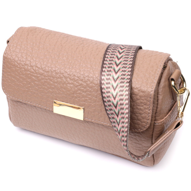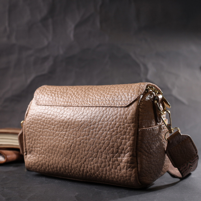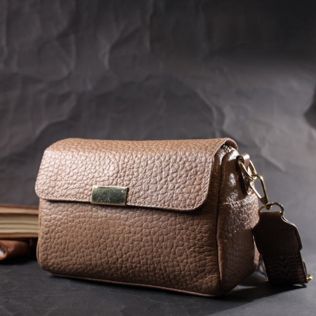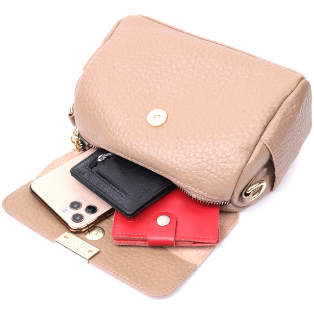 Женская небольшая сумка из качественной натуральной мягкой кожи, которая долго носится и не теряет свой первоначальный вид. Аксессуар состоит из основного отделения, потайного кармана на молнии, кармана открытого типа, а также двух небольших боковых карманов снаружи. Носить сумку можно под рукой, на плече и через плечо, для этого имеется текстильный съемный регулируемый ремень. В изделии использована качественная фурнитура цвета желтого золота. Отличный вариант сумки на каждый день.