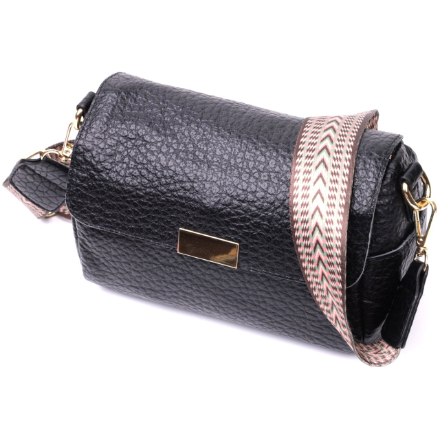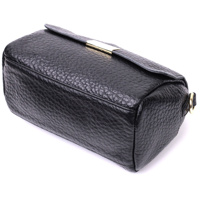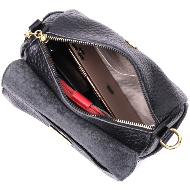 Интересная сумка для женщин в классическом черном цвете из качественной натуральной мягкой кожи, которая долго носится и не теряет свой первоначальный вид. Аксессуар состоит из основного отделения, потайного кармана на молнии, кармана открытого типа, а также двух небольших боковых карманов снаружи. Носить сумку можно под рукой, на плече и через плечо, для этого имеется текстильный съемный регулируемый ремень. В изделии использована качественная фурнитура цвета желтого золота. Отличный вариант сумки на каждый день.