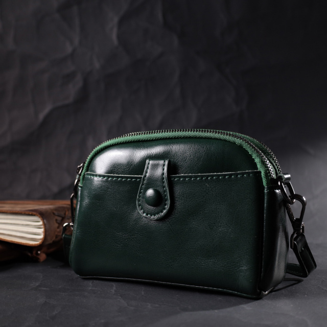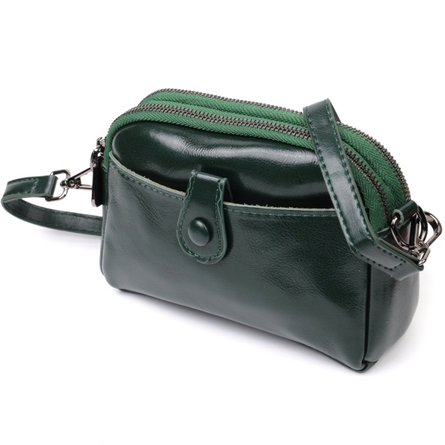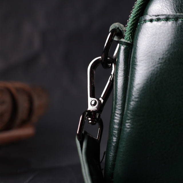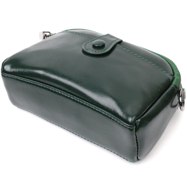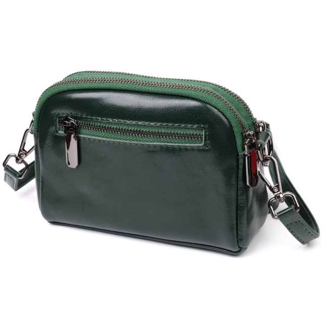 Компактная женская сумка на два автономных отделения из натуральной глянцевой кожи, которая неприхотлива в уходе и долго носится. Аксессуар состоит из двух основных отделений, потайного кармана на молнии, кармана открытого типа, кармана на лицевой стороне, что закрывается хлястиком на магнит и кармана на молнии снаружи, на тыльной стороне. Носить сумку можно в руках, на плече и через плечо, для этого имеется кожаный съемный ремень. В изделии использована качественная фурнитура цвета темного серебра. Универсальный вариант сумки как на вечер так и в качестве сумочки на каждый день.